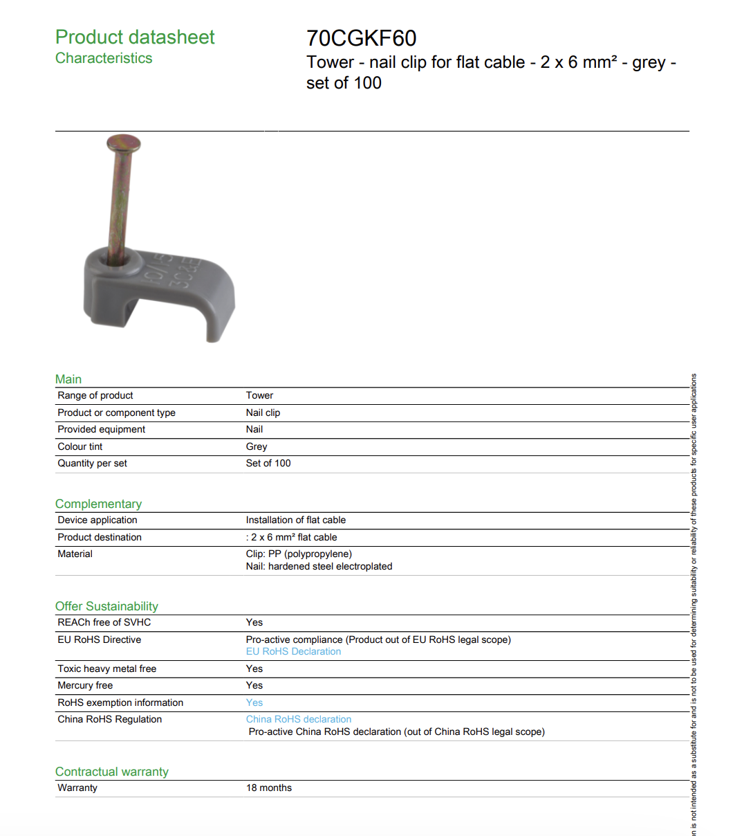70CGKF60 – Tower Nail Clip for Flat Cable (2 x 6mm²)