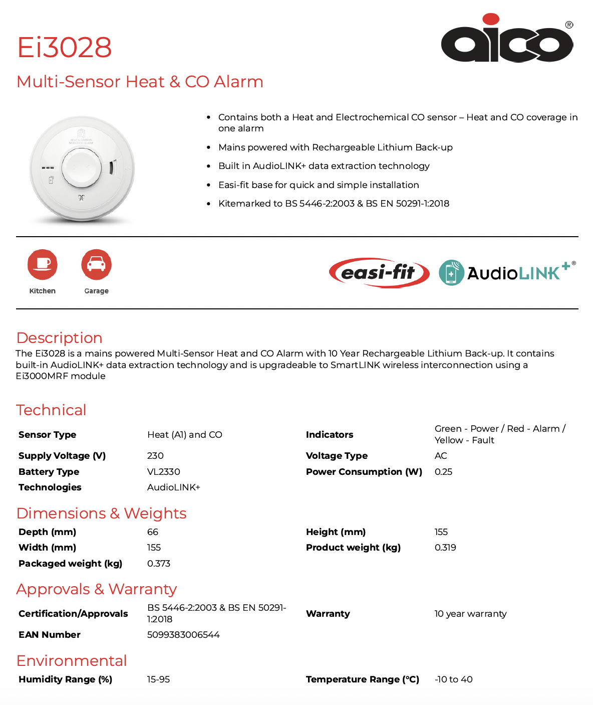 The Ei3028 is a mains powered Multi-Sensor Heat and CO Alarm with 10 Year Rechargeable Lithium Back-up. It contains built-in AudioLINK+ data extraction technology and is upgradeable to SmartLINK wireless interconnection using a Ei3000MRF module.