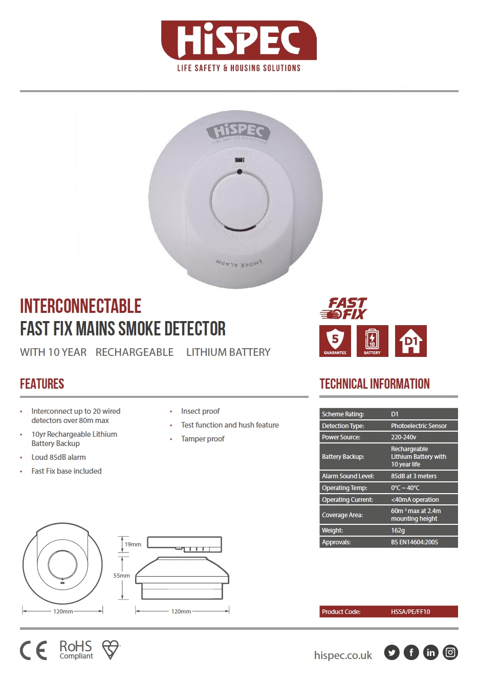 HiSpec Interconnectable Fast Fix Mains Smoke Detector