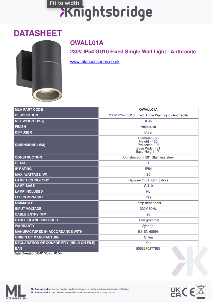 The OWALL01A 230V IP54 GU10 Fixed Single Wall Light – Anthracite is a compact and durable outdoor lighting solution designed to enhance residential and commercial exteriors. Constructed from robust stainless steel with a modern anthracite finish, it offers reliable performance with an IP54 rating for protection against dust and water. Compatible with GU10 LED or halogen lamps up to 20W, it provides flexible lighting options and is dimmable depending on the lamp used. Its sleek, minimal design makes it ideal for entrances, pathways and patios, delivering practical and energy-efficient illumination with a contemporary finish.