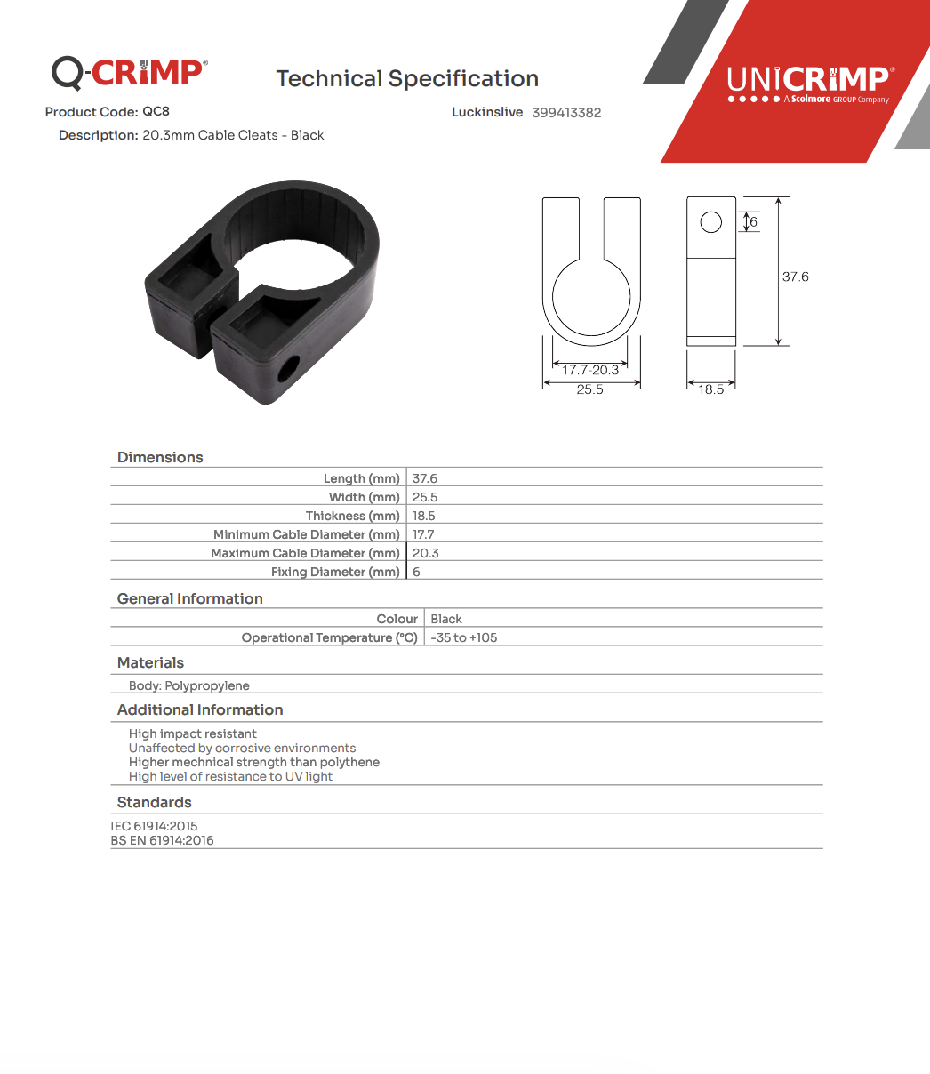 The QC8 20.3mm Cable Cleats are designed to securely fasten electrical cables with an approximate 20.3mm diameter to walls, ceilings, or other mounting surfaces. Manufactured from durable black plastic, they provide a strong and reliable fixing solution for tidy and organised cable management. Suitable for domestic, commercial, and industrial installations, these cleats help keep cable runs neat while preventing movement that could lead to wear or damage. Compatible with standard screws or nails depending on the installation surface.
