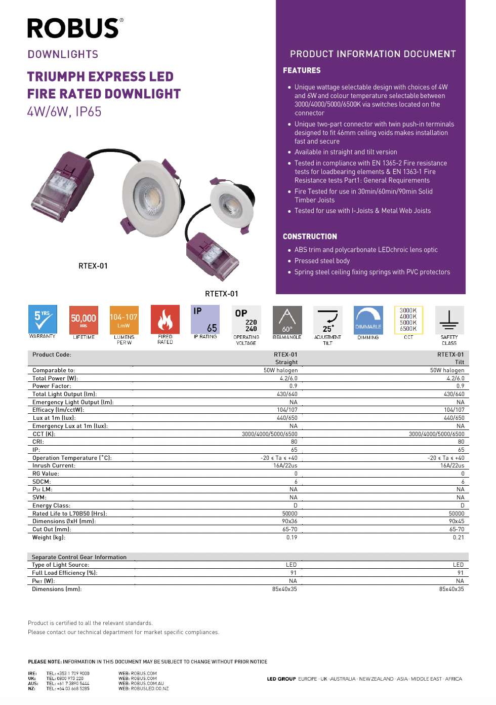 The Mauna 3 Pro Fire Rated Downlight (5W/7W, CCT Switchable) is a high-performance lighting solution designed to combine safety, efficiency and flexibility in modern installations. Featuring selectable wattage (5W or 7W) and adjustable colour temperatures, it allows you to tailor the lighting output to suit a range of environments, from warm residential settings to brighter commercial spaces. Built with fire-rated protection for added safety in ceiling installations, this downlight helps maintain the integrity of fire barriers while delivering reliable illumination. Its sleek, low-profile design ensures a clean finish in any ceiling, while energy-efficient LED technology and long lifespan reduce maintenance and running costs. Ideal for homes, offices and commercial applications, the Mauna 3 Pro offers a versatile and compliant lighting solution.