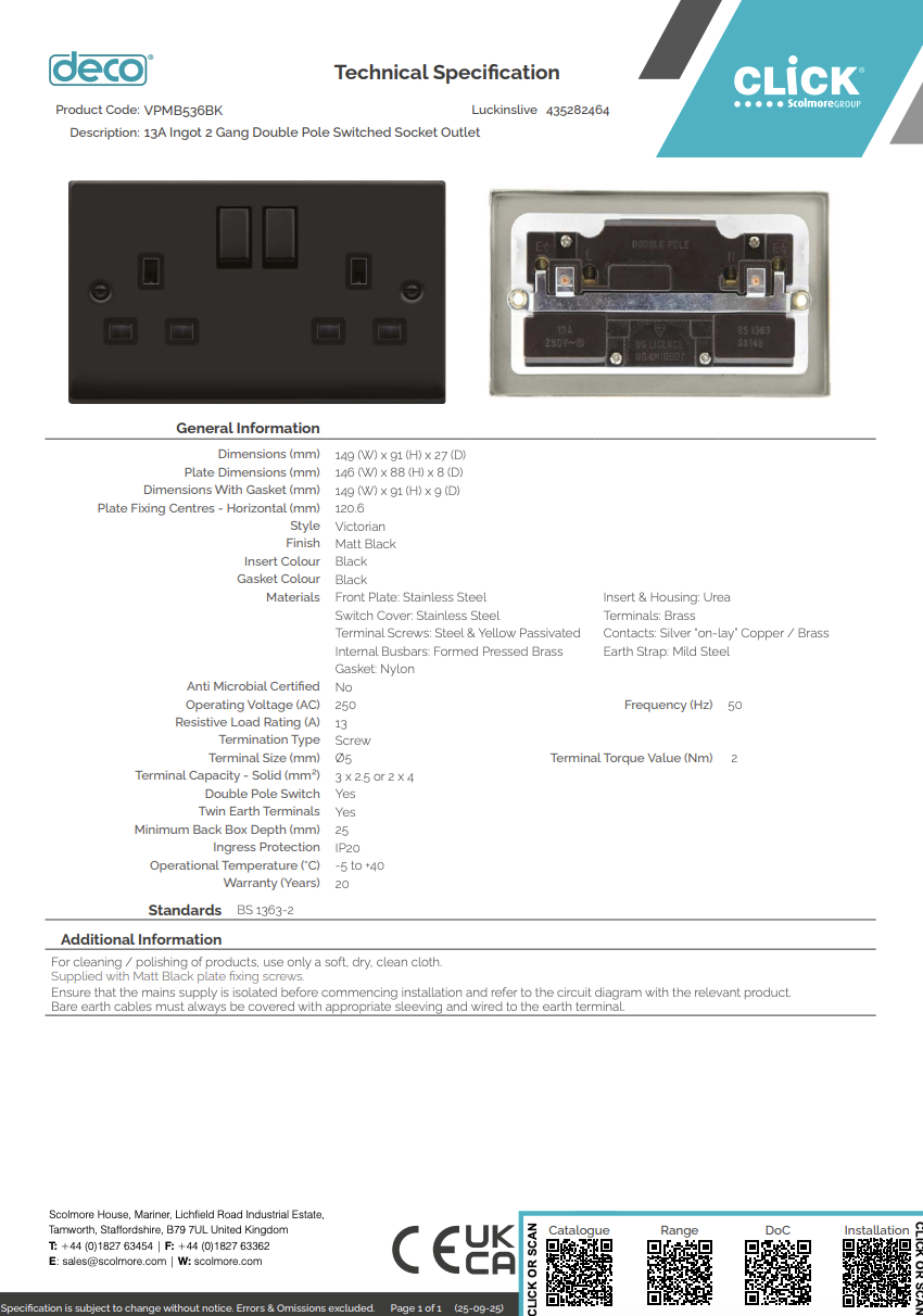 The VPMB536BK 13A Ingot 2 Gang Double Pole Switched Socket Outlet is a premium decorative wiring accessory designed for modern residential and commercial interiors. Rated at 13A and 250V, it features double pole switching to isolate both live and neutral connections, ensuring enhanced safety during operation and maintenance. The two-gang configuration allows convenient connection of multiple appliances, while twin earth terminals and generous terminal capacity support secure and reliable installation. Finished in a sleek matt black Victorian square-edge plate with a matching black insert and gasket, it delivers a contemporary, high-end aesthetic alongside durable stainless steel construction. Compatible with standard 25mm back boxes and compliant with BS 1363 standards, it provides a practical and stylish solution for everyday power requirements.